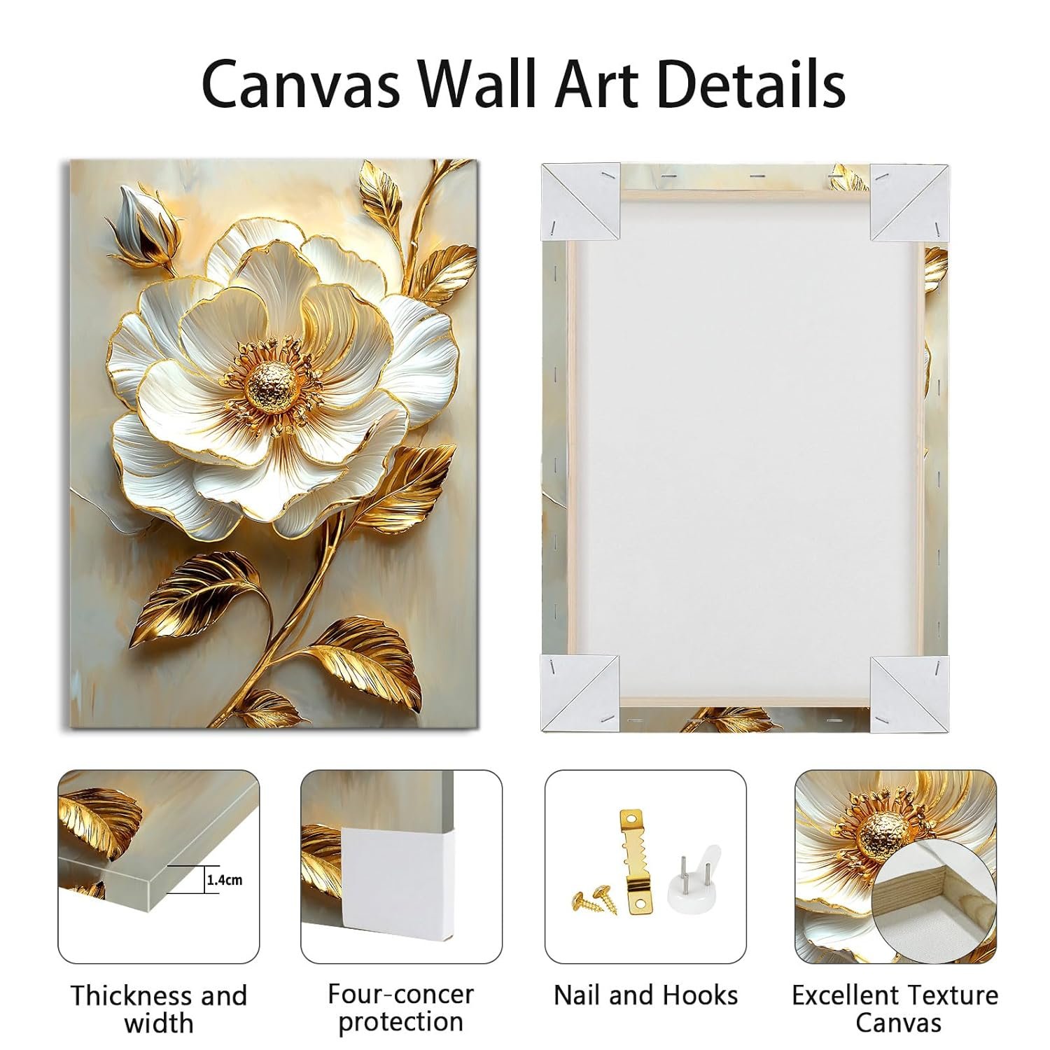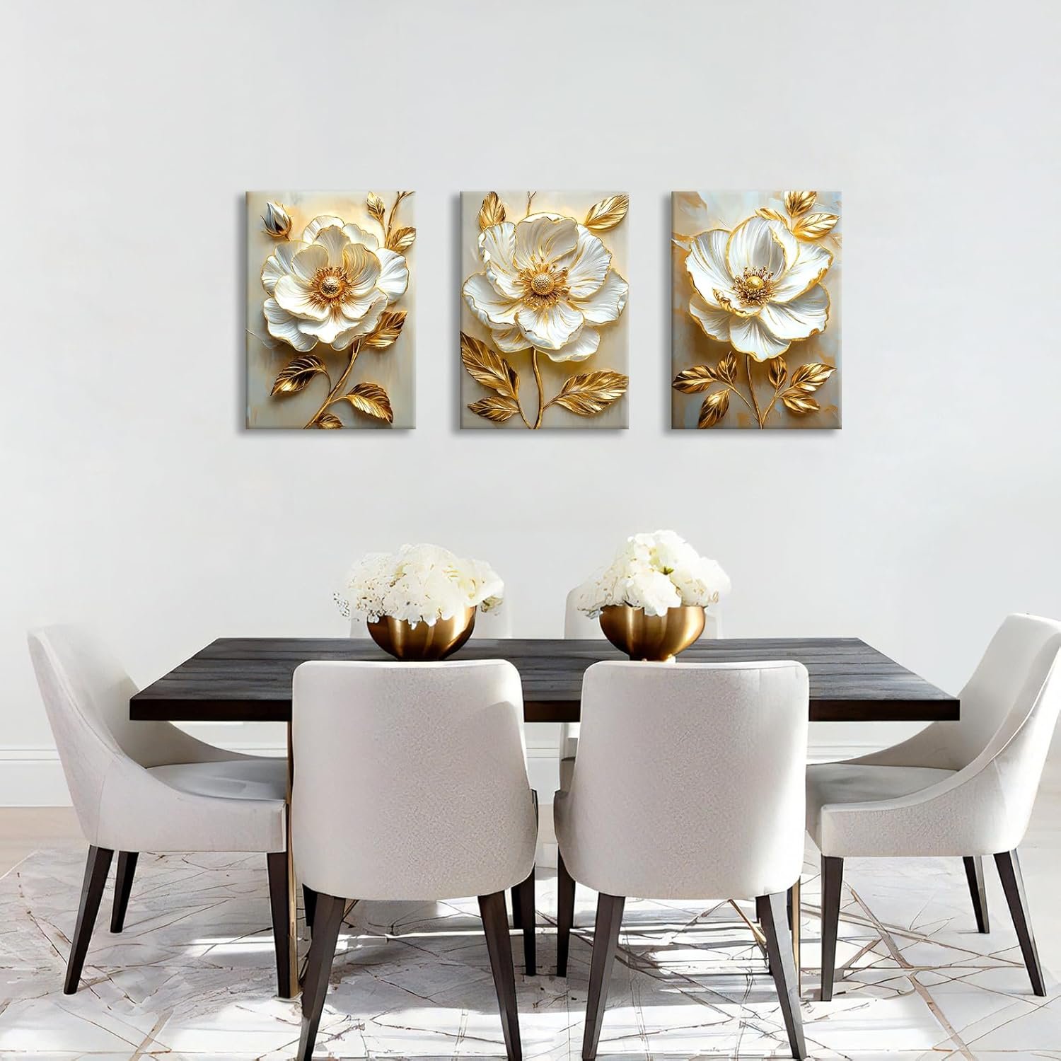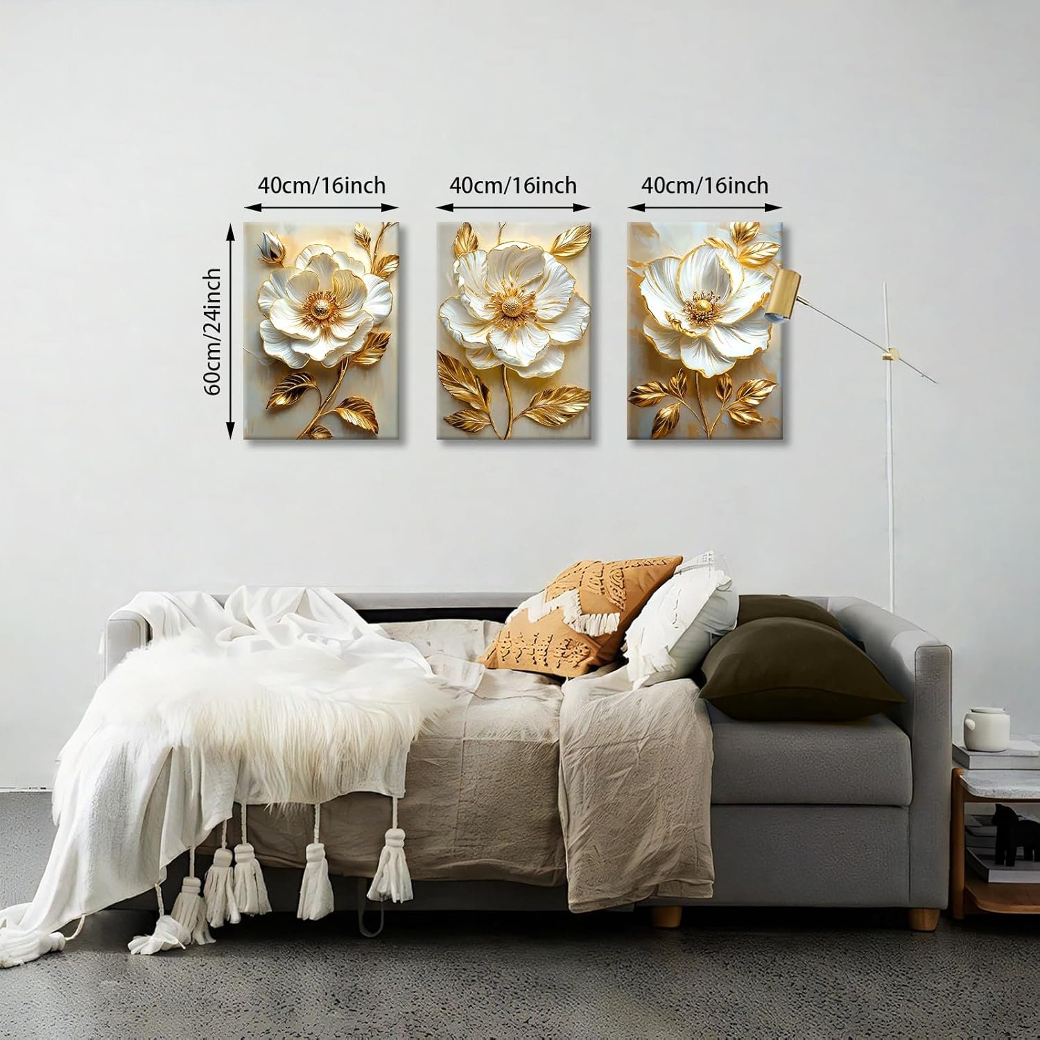 • FRAMED CANVAS WALL ART: 3d white floral golden leaves canvas wall paintings are 16″×24″(40×60cm), Total is 3 Panels, each panel is 40×60cm and with wooden frame.
